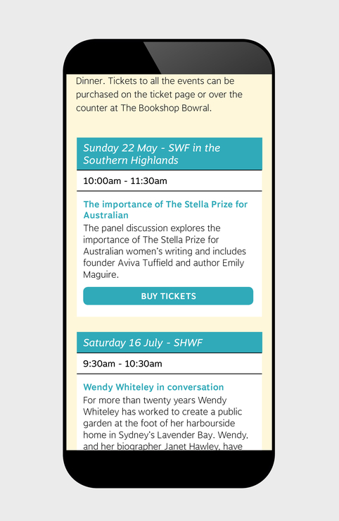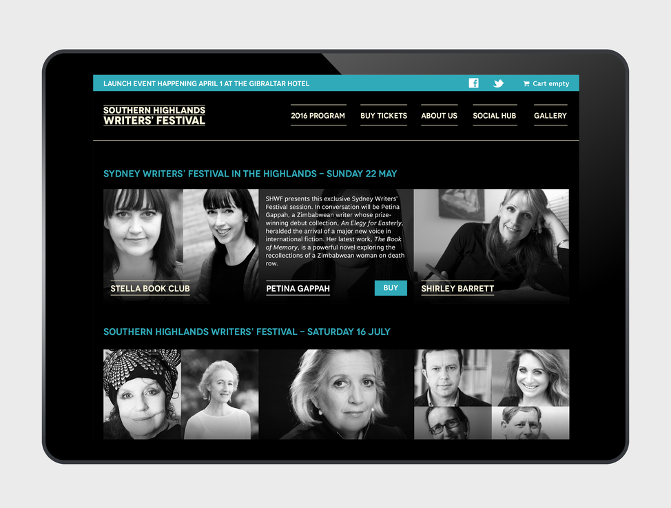 The Southern Highlands Writers’ Festival (SHWF) has been an exciting project for JND since it began in 2012. From designing the original Festival logo, print and digital collateral, we have also designed a pop-up shop, media and cinema advertising. For its fifth year, we refreshed the brand and made the website fully responsive. With festival-goers ranging in age from 15 to 90 the site is inviting and simple to navigate.